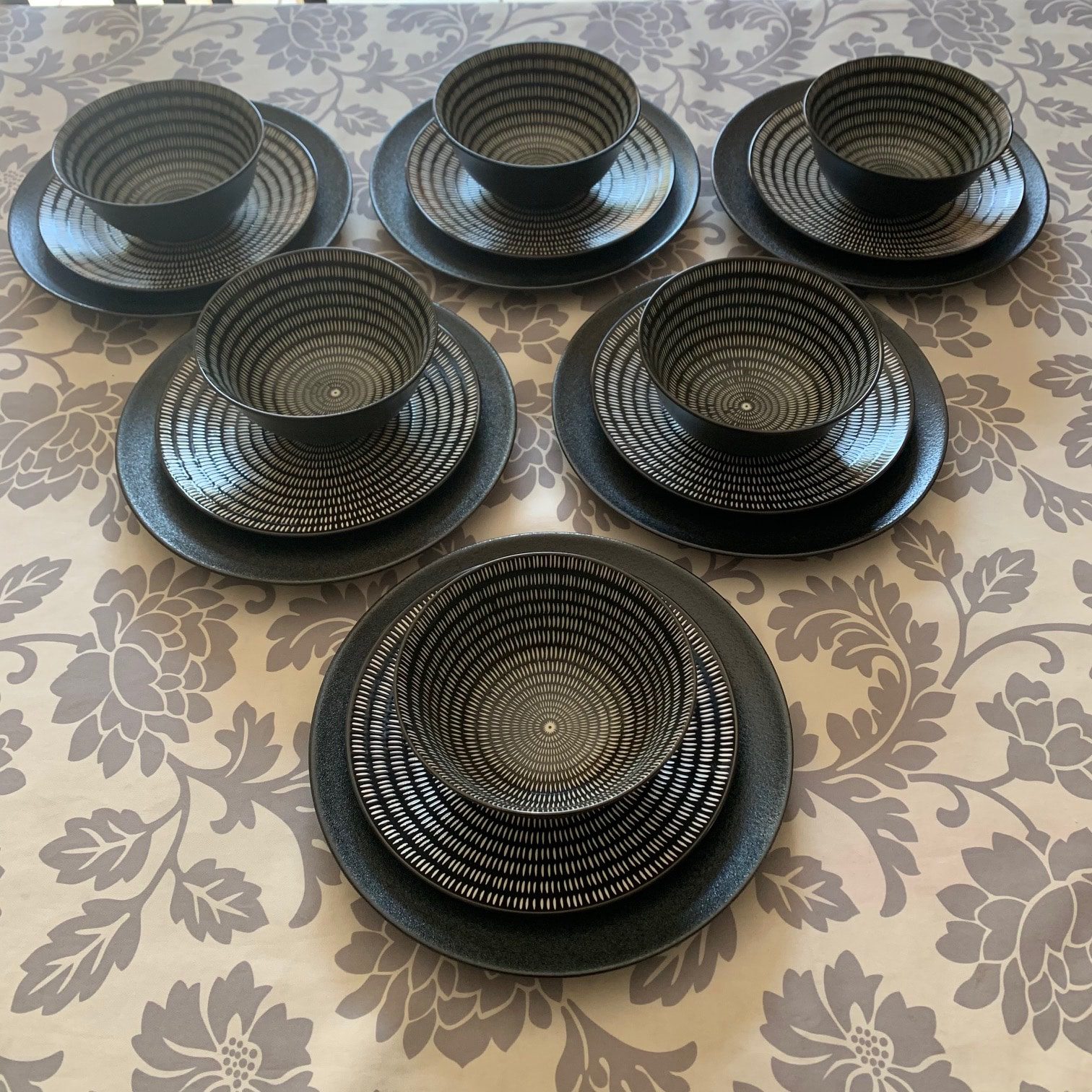 This gorgeous Dinner Set has a charcoal sandpapery texture with a black rim.